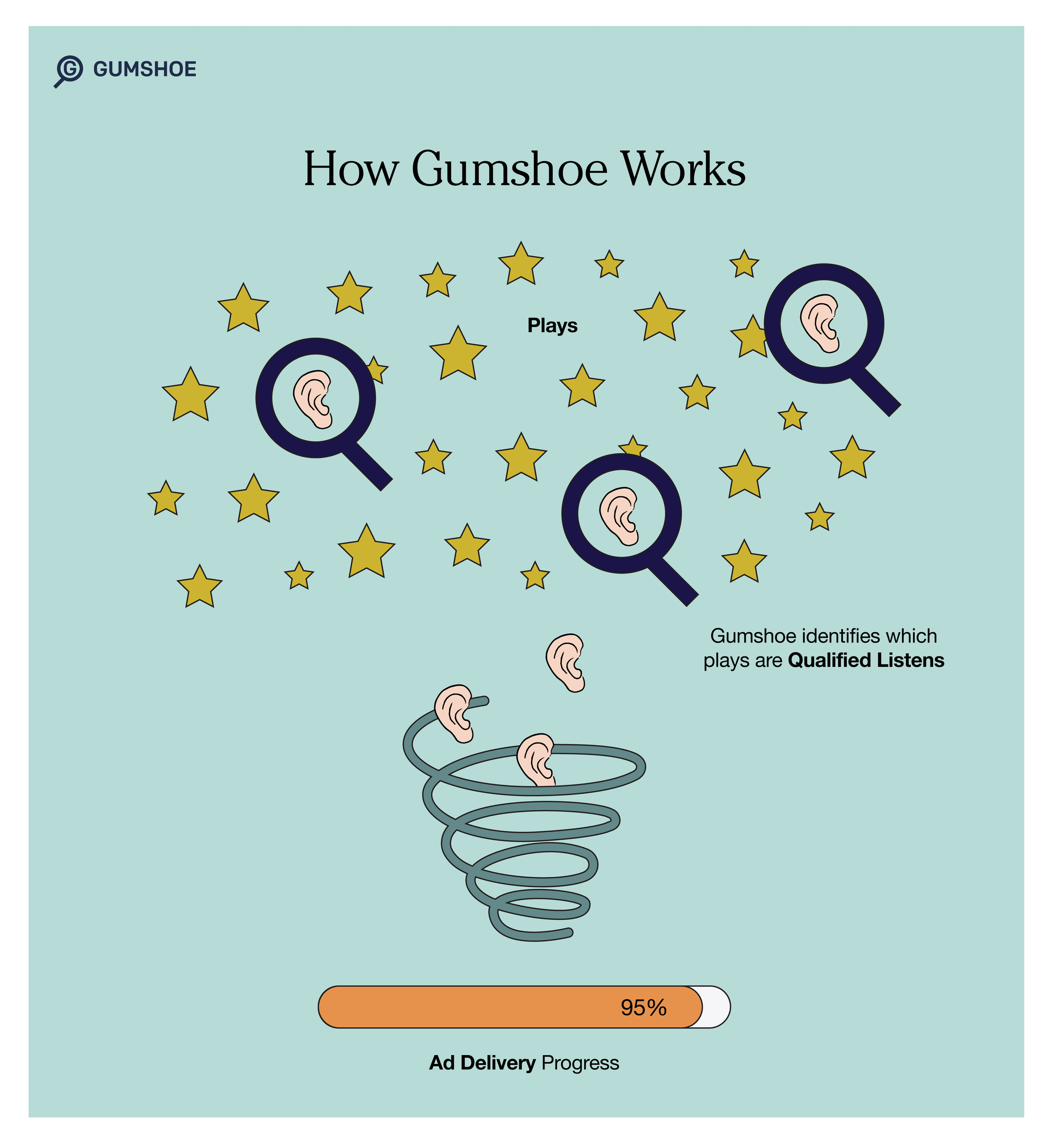 Gumshoe works by watching for requests to the audio file. If someone requests an episode with the Gumshoe prefix or tracking pixel, then Gumball receives their IP address, turns it into an anonymous key, and feeds it into a processing system, which counts plays by episode using IAB guidelines. It keeps track of each ad’s performance and displays the qualified listens as a progress bar that makes it clear to the Gumball user how many impressions their campaign has reached.