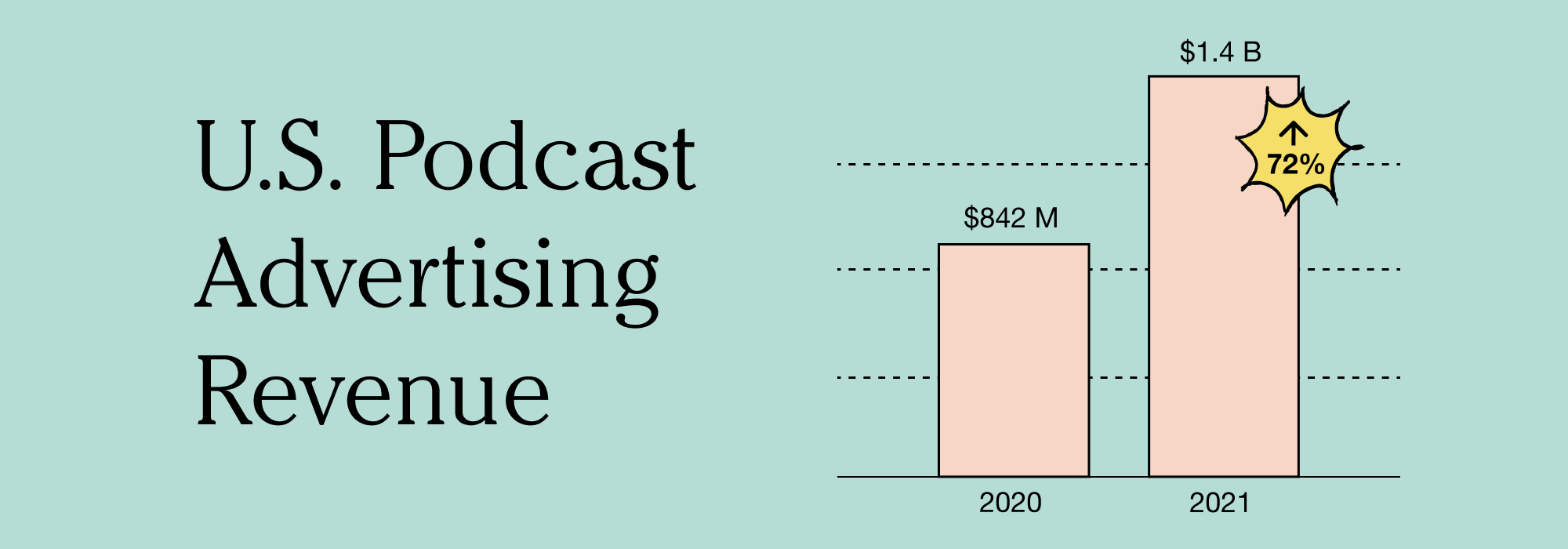 - U.S. podcast advertising revenues reached $1.4 billion in 2021, up 72% YoY. (IAB, May 2022)