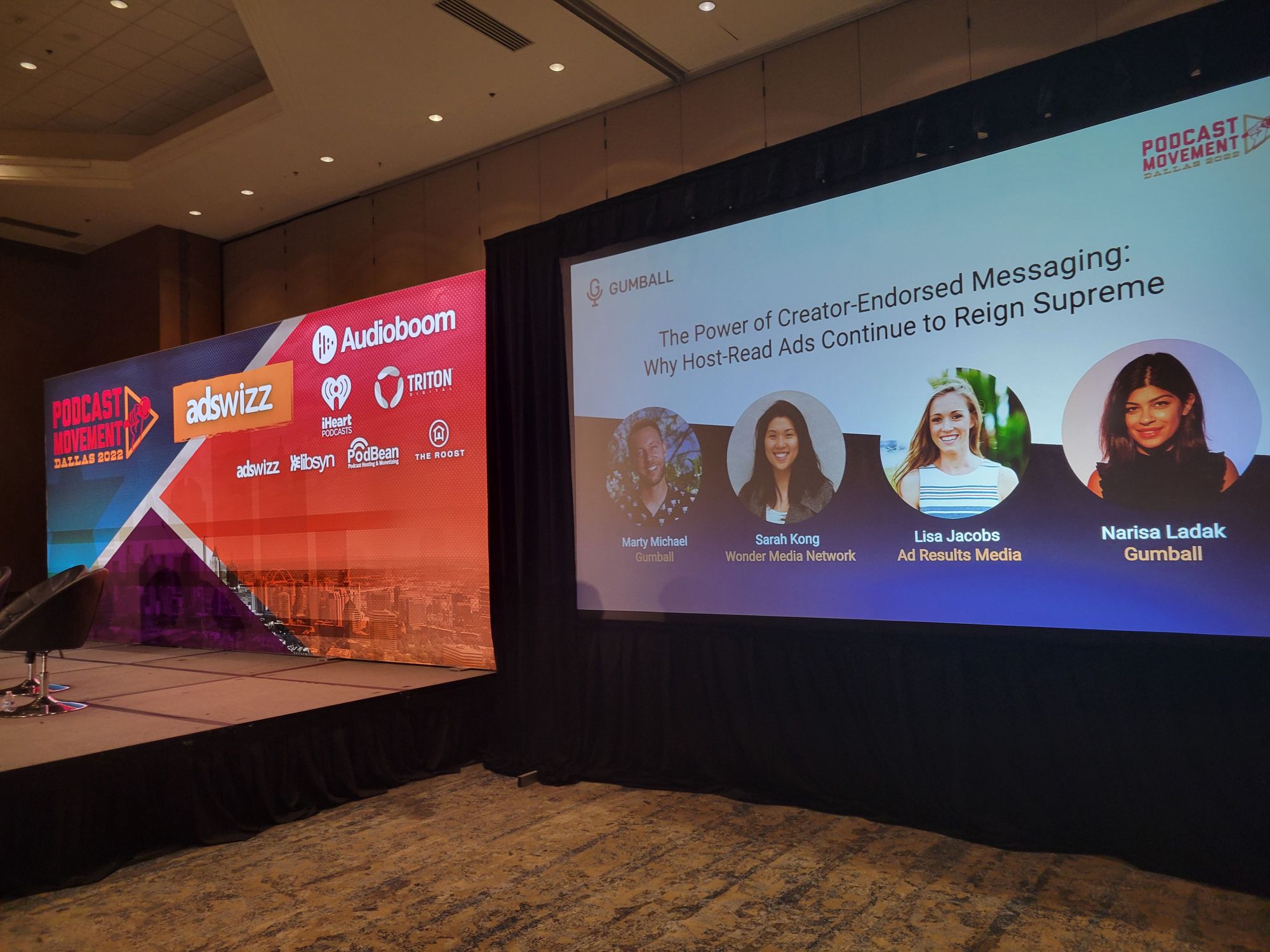Team Gumball was especially excited to host our own learning session, “The Power of Creator-Endorsed Messaging: Why Host-Read Ads Continue to Reign Supreme,” moderated by Gumball CEO Marty Michael with panelists Sarah Kong (Director of Brand Partnerships at Wonder Media Network), Lisa Jacobs (VP of Media at Ad Results Media), and Narisa Ladak (Director of Creator Partnerships at Gumball, formerly of Acast).